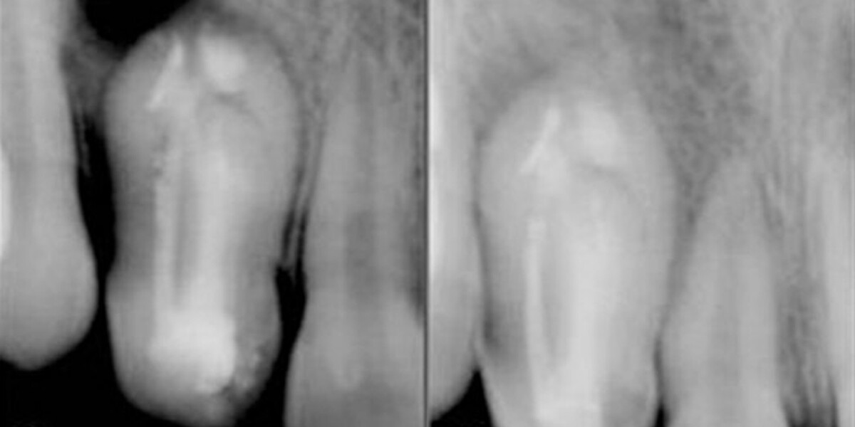 Поиск апикальных отверстий и сложная анатомия корневых каналов зачастую затрудняют лечение. Если рентгенографически не отмечается некроза пульпы и сообщения между инвагинацией и корневым каналом нет, то проводят пломбирование композитом или амальгамой. Эндодонтическое лечение показано, если инвагинация имеет отдельное апикальное или боковое отверстие , как в данном клиническом случае. В некоторых ситуациях, чтобы добраться до апикального отверстия, необходимо пройти через инвагинацию. Когда незначительные формы инвагинации устраняются, лечение корневых каналов обычно не является проблемой. Например, если инвагинация незначительных размеров, то обработка через инвагинацию уменьшает вероятность латеральной перфорации и, следовательно, лечение корневых каналов таких зубов может быть выполнено более успешно. Иногда инвагинацию следует рассматривать как отдельный корневой канал. В данном случае инвагинация была оставлена по двум важным причинам. Первая причина заключалась в том, что она была объемной, и ее удаление ослабило бы структуру зуба. Вторая же заключалась в отсутствии доступа. В результате канал инвагинации рассматривался как отдельный, и мы проводили лечение корневых каналов.
