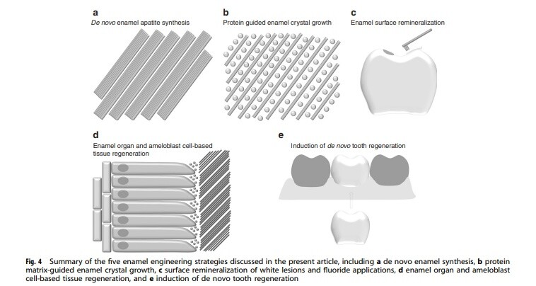 Физический синтез, биохимическое шаблонирование и контроль роста кристаллов эмали, а также реминерализация поверхности или использование листов клеток, похожих на амелобласты, для секреции белков эмали и помощи в превращении ионов кальция и фосфата в кристаллы апатита, представляют собой различные подходы к инженерии эмали. Каждый из этих подходов имеет свои концептуальные преимущества, но синтез их сильных сторон в рамках подхода регенеративной медицины имеет наибольшую вероятность верно регенерировать «настоящую» эмаль с ее высоко направленными и параллельными кристаллами апатита и перекрещивающимися пучками эмалевых призм.