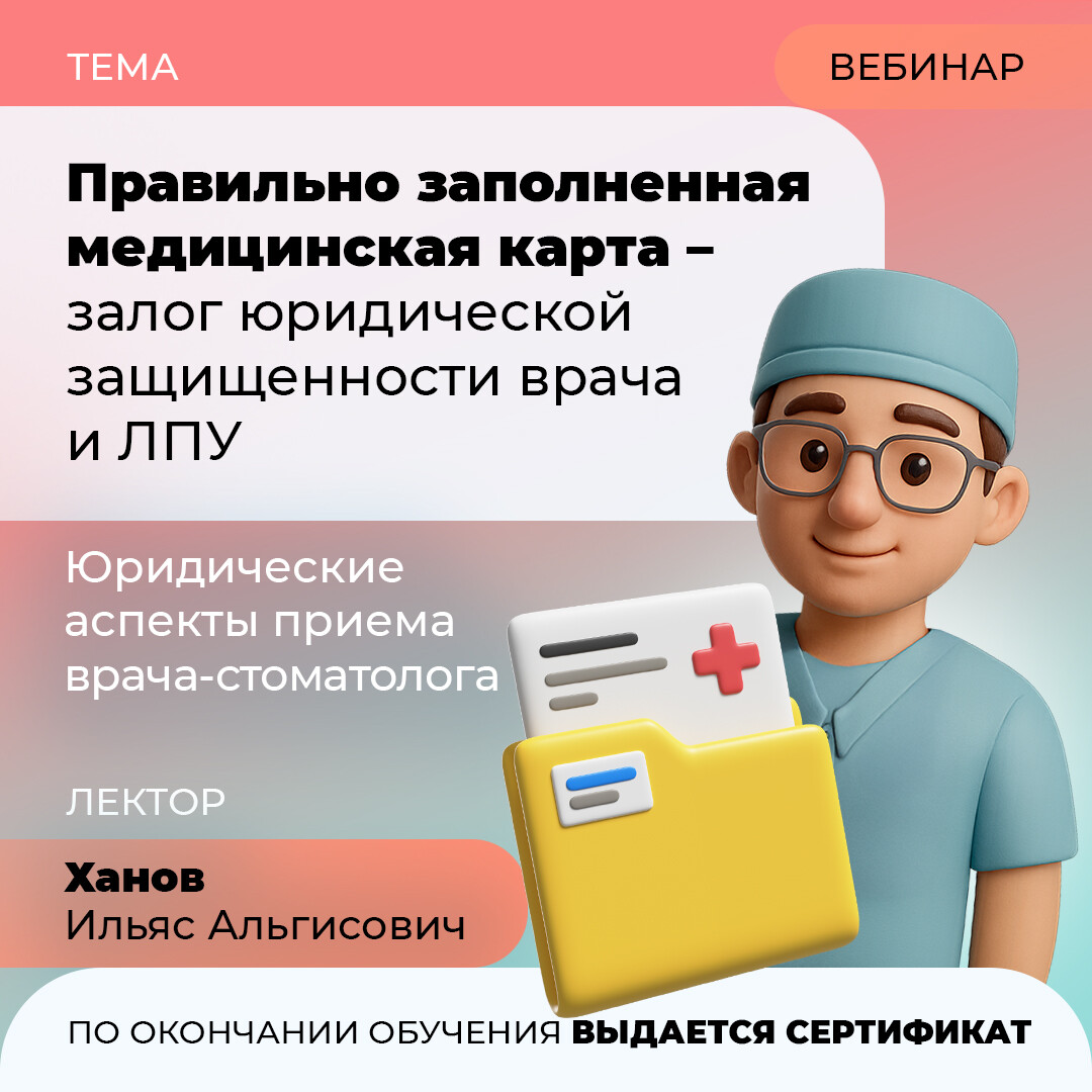 - После участия в лекции выдается сертификат с названием курса «Юридические аспекты приема врача-стоматолога»